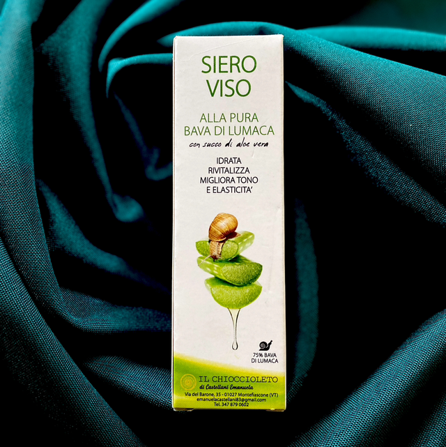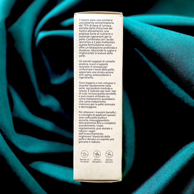 Il nostro siero contiene il 75% di Bava di Lumaca ESTRATTA DALLE CHIOCCIOLE DEL NOSTRO ALLEVAMENTO che insieme alla centella asiatica, rusco e luppolo lavorano in sinergia per uniformare il tono della pelle, apportare una mirata azione anti-aging e rigenerante.
